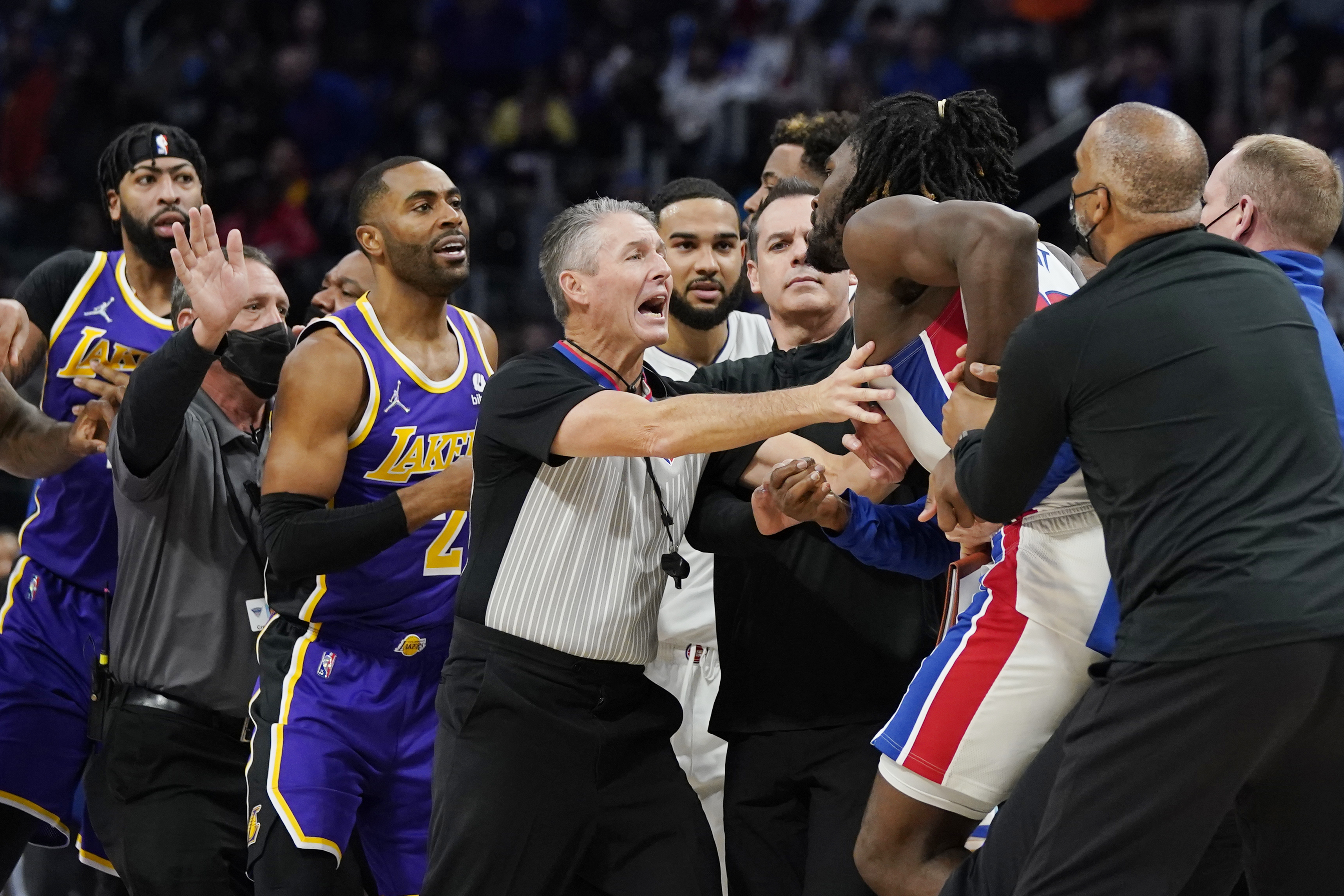 … Or so we all thought, because it turns out Stewart wasn’t really calm. Stewart still wanted James’ head, so he made everyone think he was fine and then charged at James again. It looked a lot like an NFL running back swerving through defenders, trying not to get taken down. Although he shoved off the first few people that tried to hold him, he was eventually stopped by three coaches and Cade Cunningham, the first pick in the 2021 NBA Draft. With blood by his eye socket and streaming down his face, Stewart made his way back to the locker room, for it was already a foregone conclusion he was ejected… except he didn’t stop there. Once he was about to exit the floor, pushing off the arm of one of his coaches, Stewart turned around, charging at James while seeing red (literally and figuratively). He got through nearly the entire Pistons’ staff and almost made it to the Lakers end of the floor before he was stopped, and I don’t doubt he would have knocked James unconscious if he had the chance. Eventually, after the third and final time, Stewart and James were both ejected, and play resumed.
